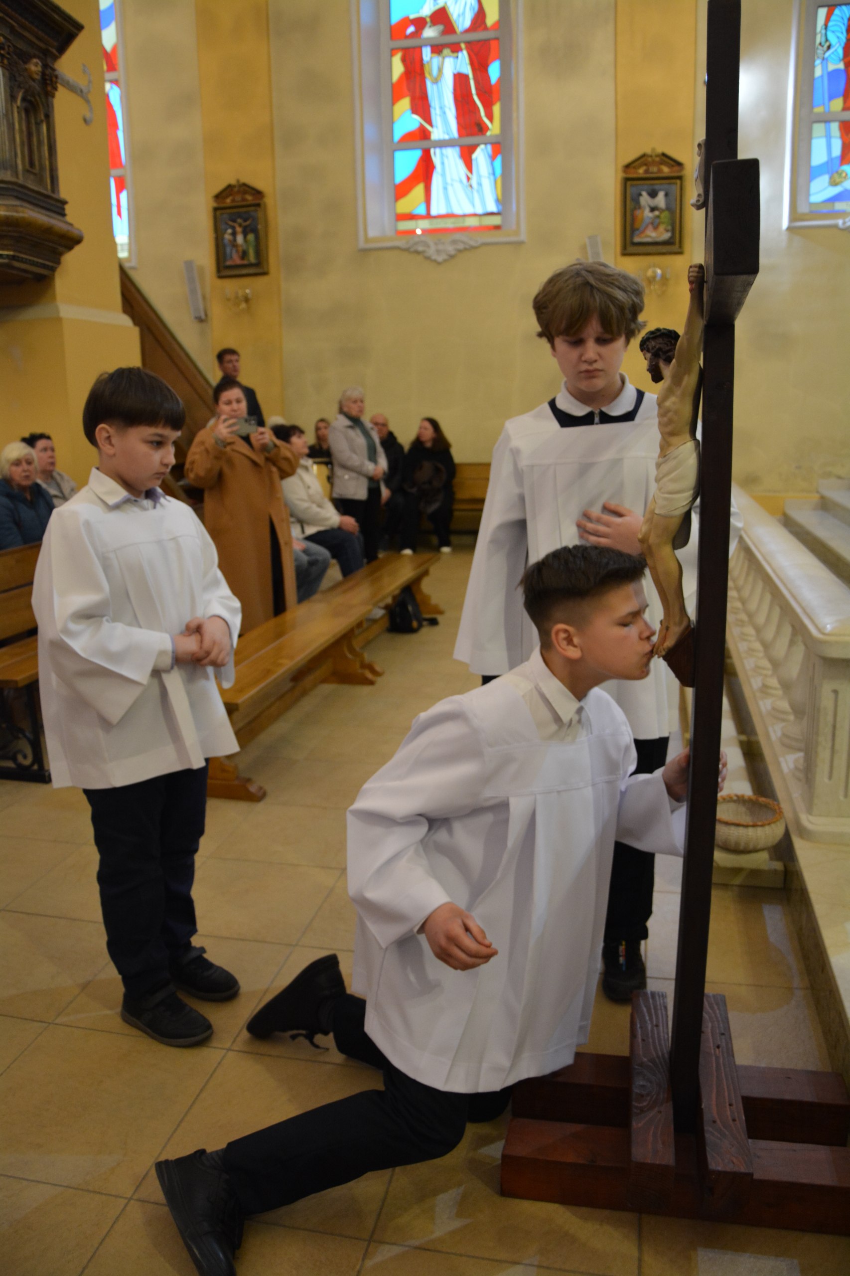 Ушанаванне Крыжа – гэта самая характэрная частка літургіі, якая пачынаецца з аб’яўлення Крыжа. Святар урачыста ўносіць закрыты крыж, паступова адкрываючы яго, спяваючы пры гэтым: “Вось дрэва крыжа, на якім вісеў Збаўца свету”, вернікі адказваюць: “Пойдзем з паклонам”.